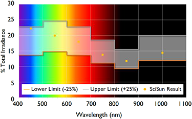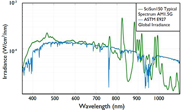 配以空氣濾片,SciSun太陽模擬器的光譜輸出非常接近太陽光譜,如圖所示