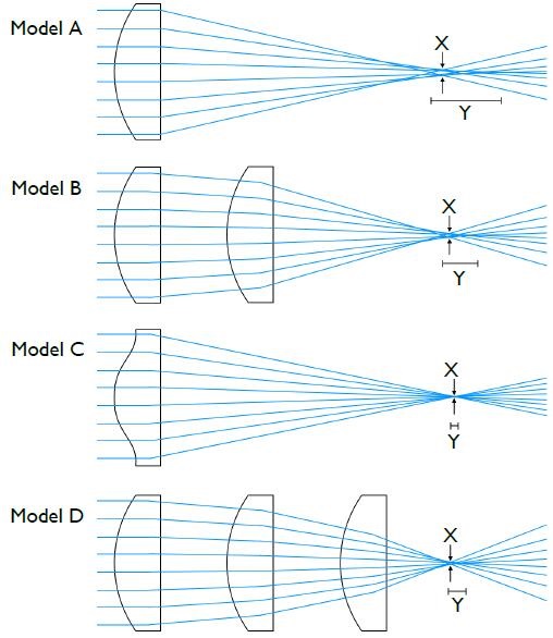D型-三透鏡系統(tǒng):一種高質(zhì)量的選件,與Model A或Model B相比,聚焦時的光斑尺寸更小,或者在準直時具有更高的質(zhì)量準直。它的材料范圍也比Model C多。